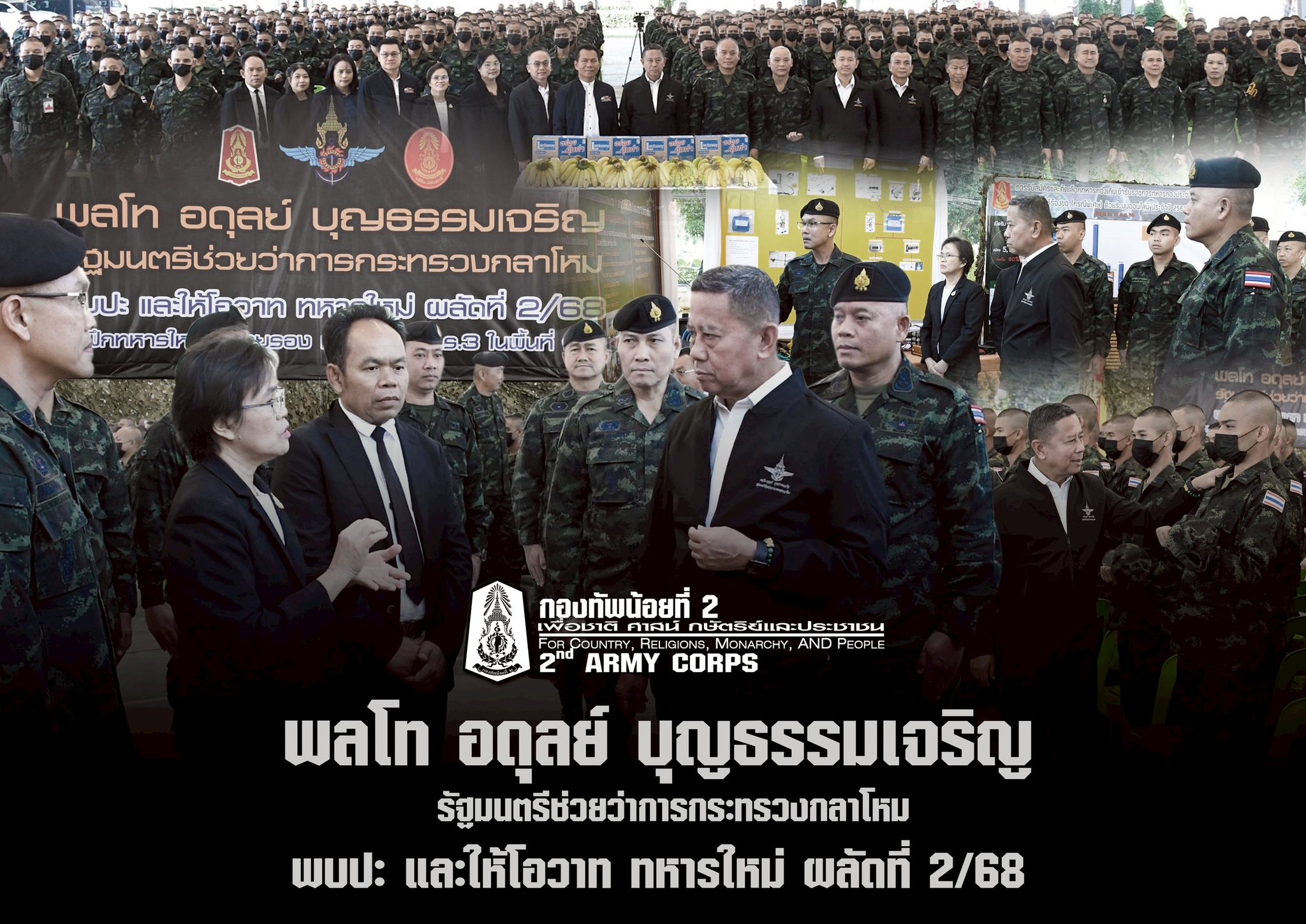 “มทน.2 ตรวจเยี่ยมให้กำลังใจทหารใหม่ ผลัดที่ 2/68 “เมื่อวันที่ 12 พฤศจิกายน 2568 พลโท ปิยะพณห์ ฐิตวัฒนานนท์ และคณะฯ เดินทางตรวจเยี่ยม พบปะทหารใหม่ ผลัดที่ 2/68 เพื่อรับทราบปัญหา/ข้อขัดข้อง ในการฝึกฯ และเพื่อเป็นขวัญกำลังใจให้กับทหารใหม่ ให้สามารถปรับสภาพจากบุคคลพลเรือน พร้อมเป็นทหารอย่างภาคภูมิ ทั้งนี้ แม่ทัพน้อยที่ 2 ได้เน้นย้ำในการสร้างความรู้ความเข้าใจในการฝึกตามแนวทางของผู้บัญชาการทหารบกและปลูกฝังอุดมการณ์ความรักชาติ ศาสนา สถาบันพระมหากษัตริย์ พร้อมทั้งได้มอบสิ่งของบำรุงขวัญให้แก่หน่วยฝึกทหารใหม่ ณ กองพันทหารปืนใหญ่ที่ 103 กรมทหารปืนใหญ่ที่ 3 ค่ายสุรนารี อำเภอเมือง จังหวัดนครราชสีมา
