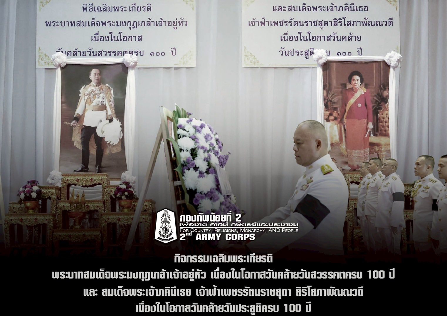 ทน.2 ร่วมกิจกรรมเฉลิมพระเกียรติพระบาทสมเด็จพระมงกุฎเกล้าเจ้าอยู่หัว และสมเด็จพระเจ้าภคินีเธอ เจ้าฟ้าเพชรรัตนราชสุดา สิริโสภาพัณณวดี 24 พฤศจิกายน 68 พลโท ปิยะพณห์ ฐิตวัฒนานนท์ แม่ทัพน้อยที่ 2 พร้อมคณะผู้บังคับบัญชา ร่วมกิจกรรมเฉลิมพระเกียรติพระบาทสมเด็จพระมงกุฎเกล้าเจ้าอยู่หัว เนื่องในโอกาสวันคล้ายวันสวรรคตครบ 100 ปี 25 พฤศจิกายน 2568 และสมเด็จพระเจ้าภคินีเธอ เจ้าฟ้าเพชรรัตนราชสุดา สิริโสภาพัณณวดี เนื่องในโอกาสวันคล้ายวันประสูติครบ 100 ปี 24 พฤศจิกายน 2568 โดยกิจกรรมประกอบด้วย พิธีทำบุญตักบาตรพระสงฆ์ 10 รูป, พิธีเจริญพระพุทธมนต์ถวายเป็นพระราชกุศล ณ พุทธศาสนสถานและพิธีวางพวงมาลา วางพานพุ่มดอกไม้ ณ สโมสรร่วมเริงไชย ค่ายสุรนารี อำเภอเมืองฯ จังหวัดนครราชสีมา โดยมี พลโท วีระยุทธ รักศิลป์ แม่ทัพภาคที่ 2 เป็นประธานในพิธีฯ