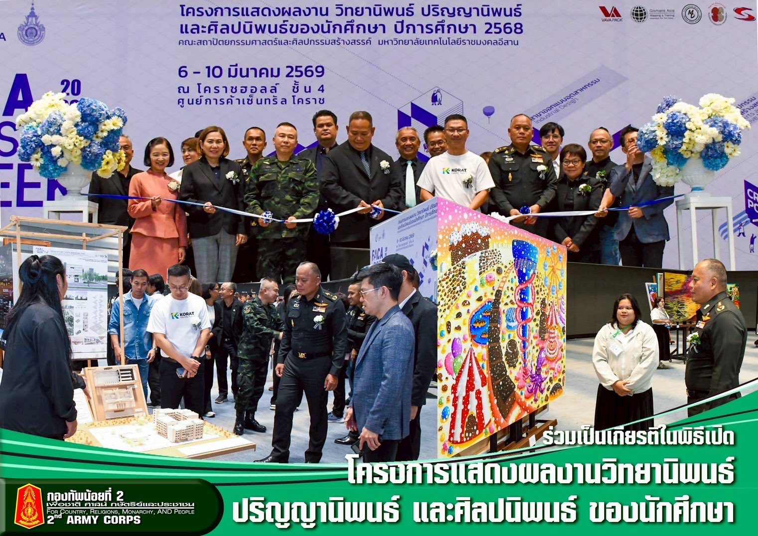 แม่ทัพน้อยที่ 2ร่วมเป็นเกียรติในพิธีเปิดโครงการแสดงผลงานวิทยานิพนธ์ ปริญญานิพนธ์ และศิลปนิพนธ์ ของนักศึกษา คณะสถาปัตยกรรมศาสตร์ และศิลปกรรมสร้างสรรค์ เมื่อวันที่ 6 มีนาคม 2569 พลโท ปิยะพณห์ ฐิตวัฒนานนท์ แม่ทัพน้อยที่ 2 ร่วมเป็นเกียรติในพิธีเปิดโครงการแสดงผลงานวิทยานิพนธ์ ปริญญานิพนธ์ และศิลปนิพนธ์ ของนักศึกษา คณะสถาปัตยกรรมศาสตร์ และศิลปกรรมสร้างสรรค์ โดยมีวัตถุประสงค์เพื่อให้นักศึกษาชั้นปีสุดท้ายได้เผยแพร่ผลงานให้แก่บุคคลทั่วไปรับทราบและตระหนักถึงความสำคัญของวิชาชีพทั้ง 7 ด้าน ที่คณะสถาปัตยกรรมศาสตร์ และศิลปกรรมสร้างสรรค์ จัดการเรียนการสอน และเพื่อให้อาจารย์ได้ประชาสัมพันธ์ให้กับนักเรียนมัธยมศึกษาตอนปลาย และนักศึกษาสายอาชีพได้รู้จักผลงานของนักศึกษาคณะสถาปัตยกรรมศาสตร์ และศิลปกรรมสร้างสรรค์ ให้สามารถเลือกเข้าศึกษาในสาขาที่เปิดสอนได้อย่างถูกต้องเหมาะสมกับความต้องการของตนเอง ณ โคราช ฮอลล์ ชั้น 4 ศูนย์การค้าเซ็นทรัลโคราช จังหวัดนครราชสีมา โดยมีนายวิจิตร กิจวิรัตน์ รอง ผู้ว่าราชการจังหวัดนครราชสีมา (1) เป็นประธานในพิธีฯ